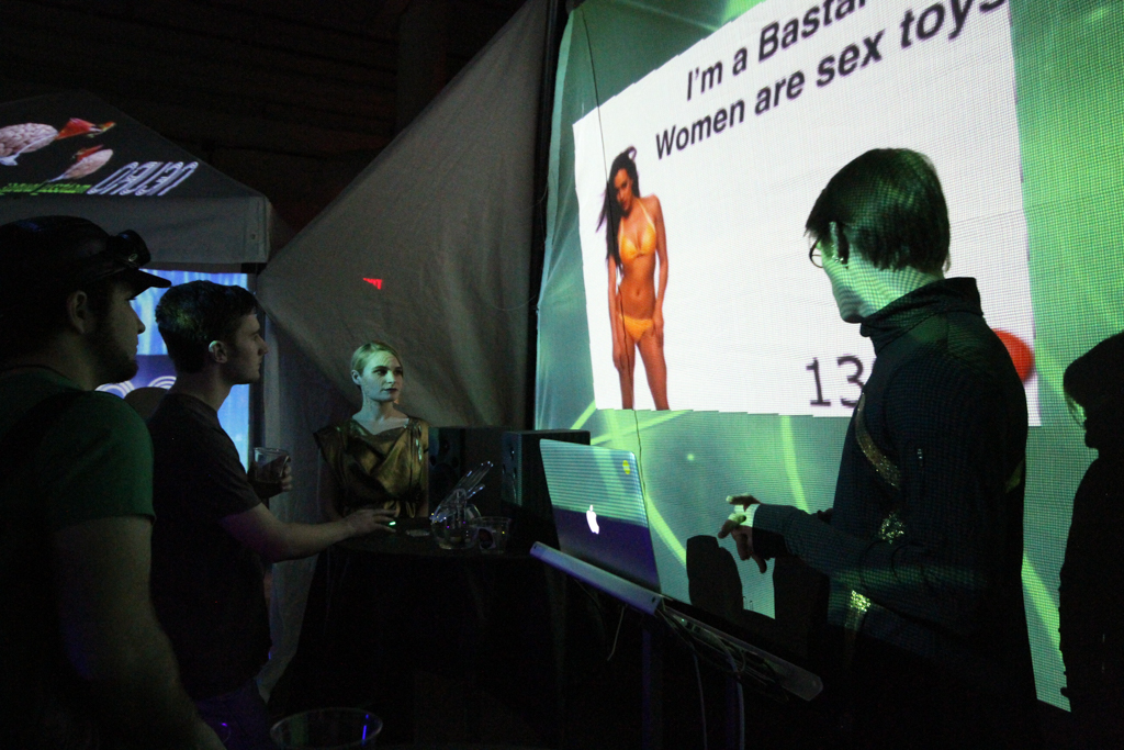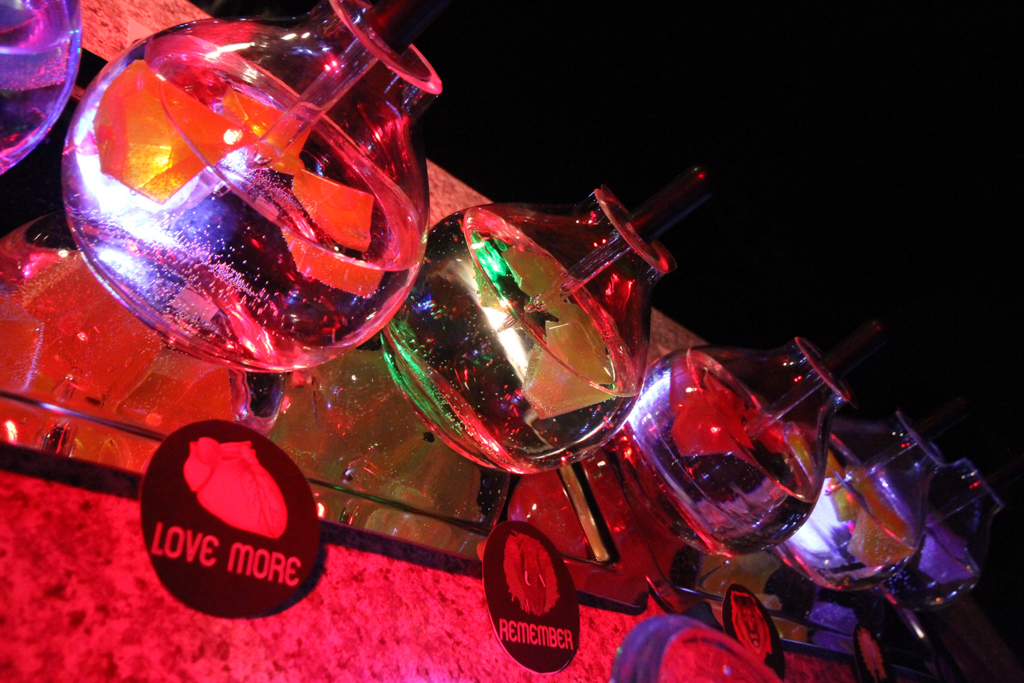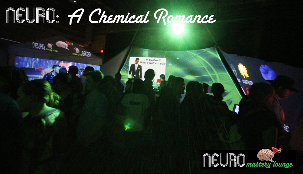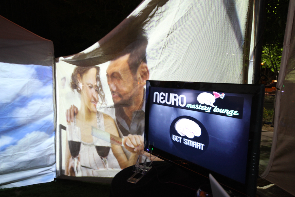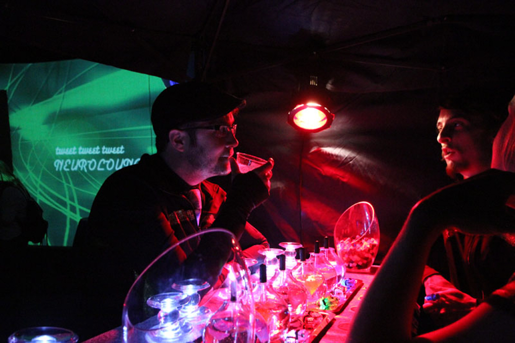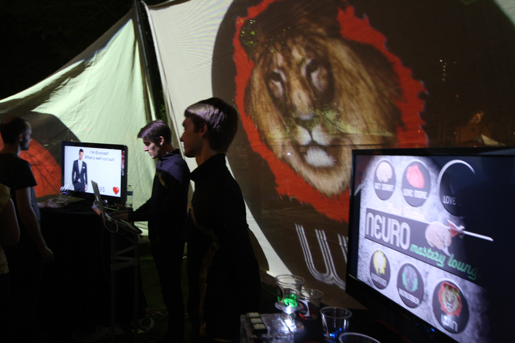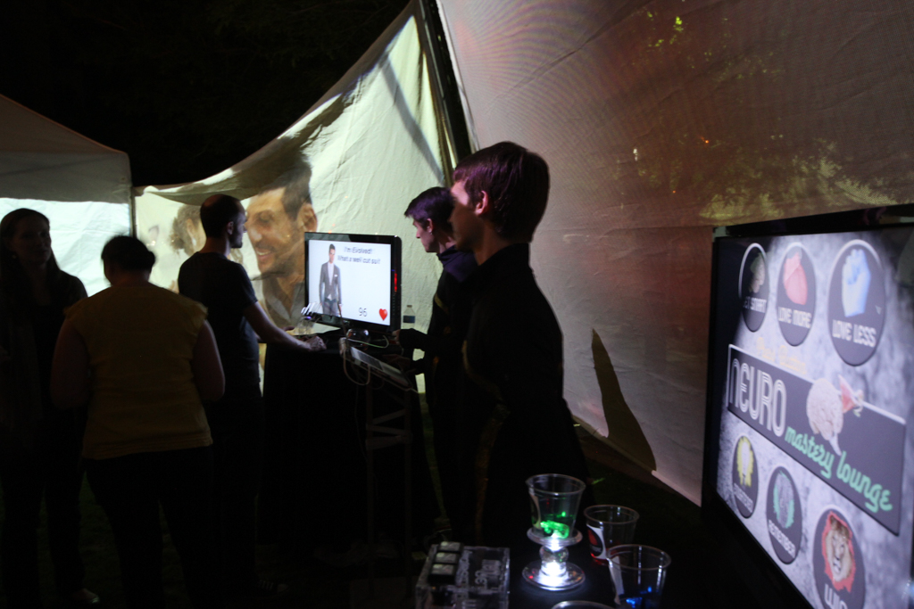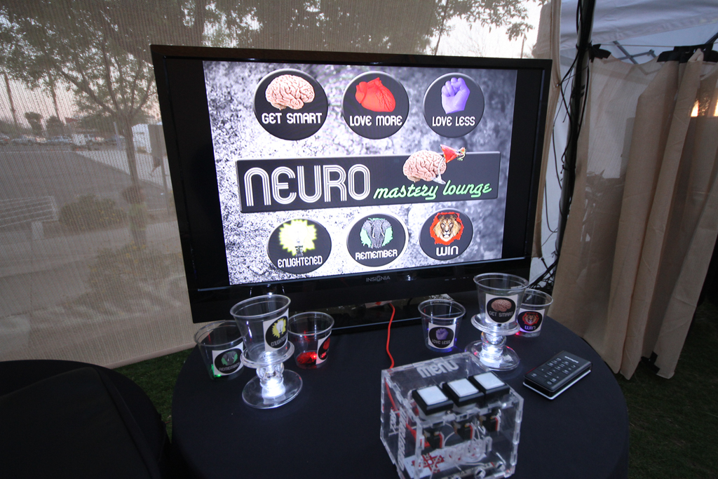Summary: Neuro was a design fiction interactive theatre piece set in an imagined psychotropic cocktail lounge attempting to capitalize on new pharmaceuticals that could control moral judgment. The immersive installation featured 360 degrees of interactive video walls and the development of performative biofeedback machines designed to quantify individual morality. Real EEG scanner and heart rate monitor data was captured from ‘customers’ as they played various games testing levels of religiosity, romantic compatibility, bigotry, racism, greed, and altruism. Each game concluded with recommendations for psychotropic cocktails to fix their moral failings.