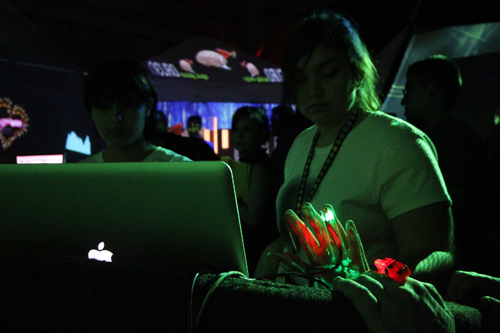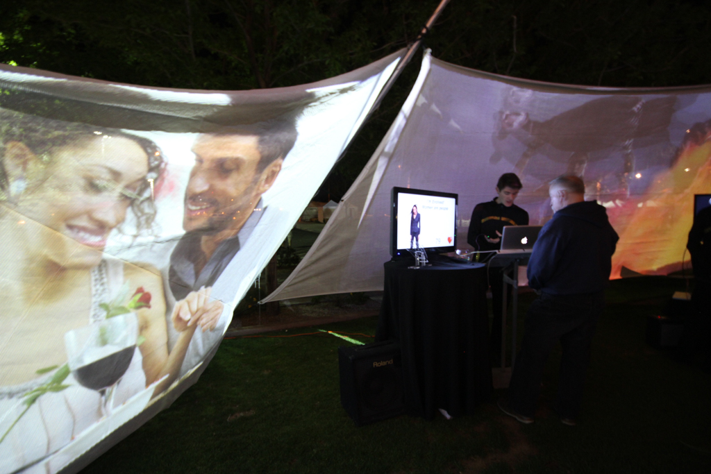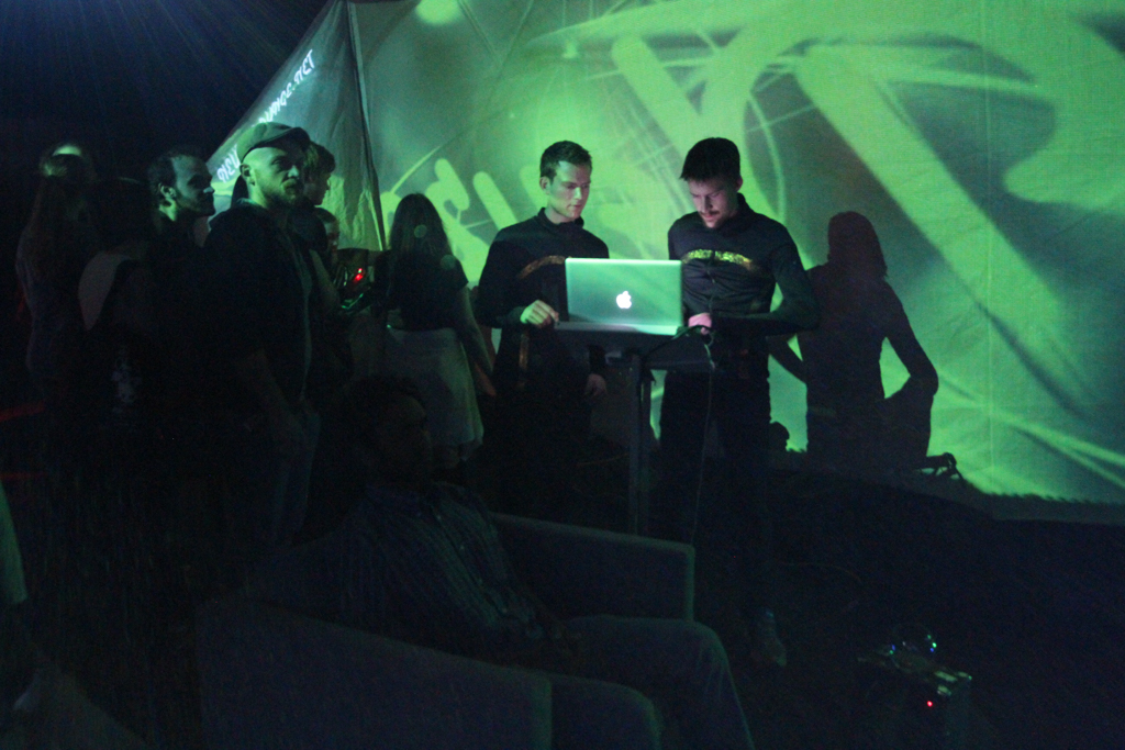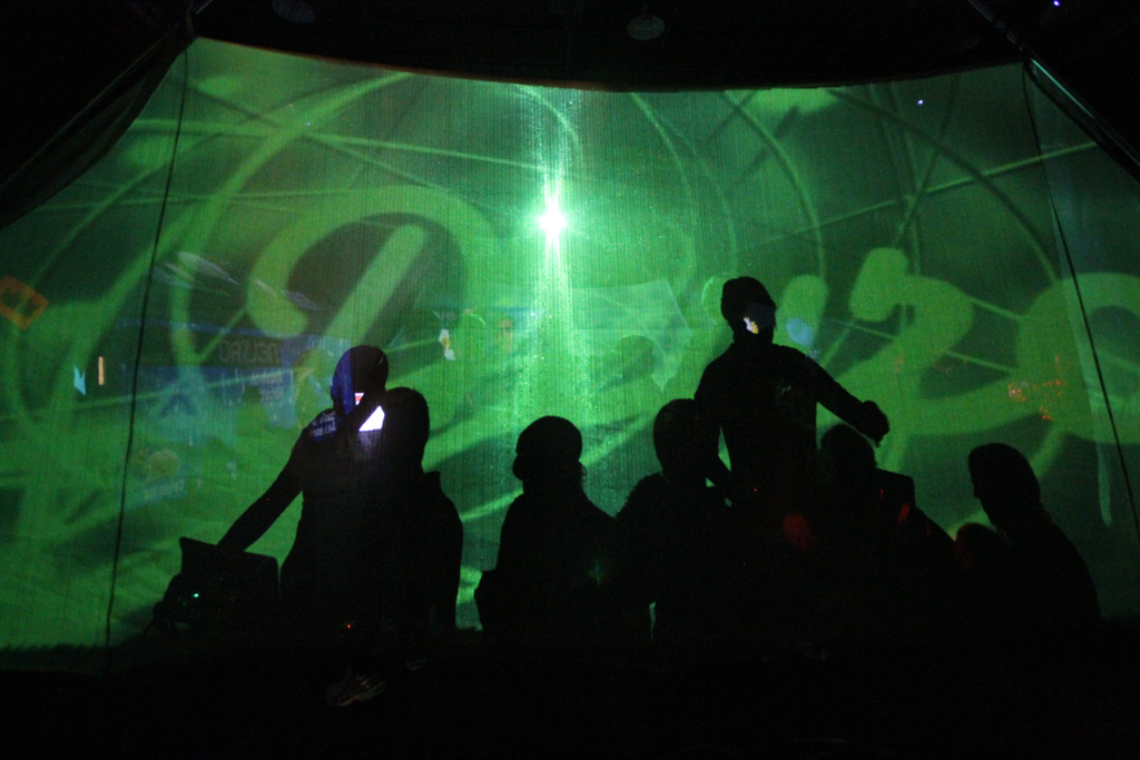 Projectors hung from an 18ft aerial rig surrounded the audience with video content mapped to 5 tension fabric walls played back interactively with Modul8.