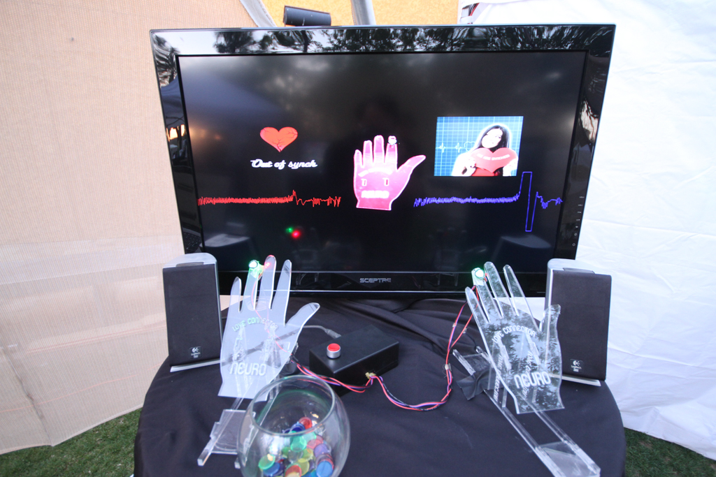 The interactive systems used PulseSensor heart rate monitors, Arduino microcontrollers, and an Emotive EEG reader for biofeedback. The Love Connector {Branch) was developed with Processing and tested the synchronicity of two partners as they observed various imagery, the De Objectifier(Ragan) was also programmed in Processing and demonstrated the emotional intensity behind the natural objectification of others, and the E –Value -Ator (Eglen) programmed in Max MSP used the EEG reader to asses how stated values matched up with cognitive interest when users were shown various imagery.