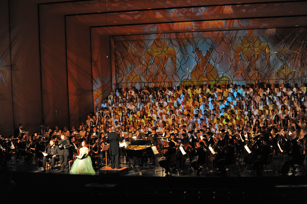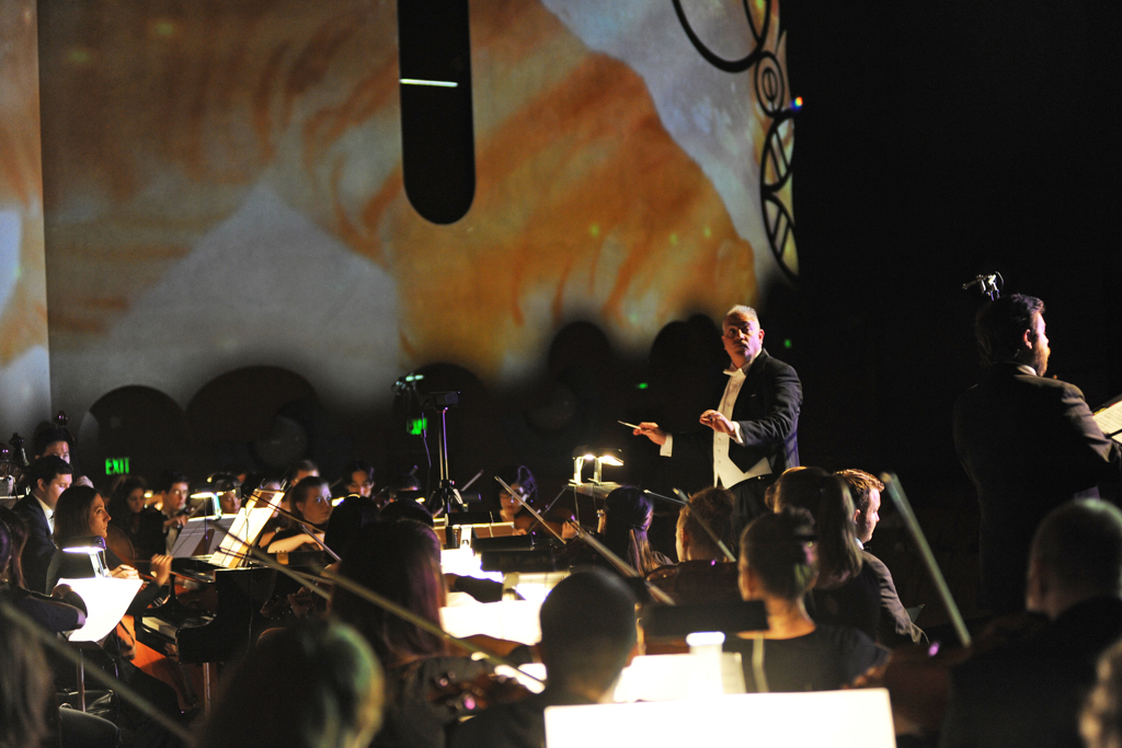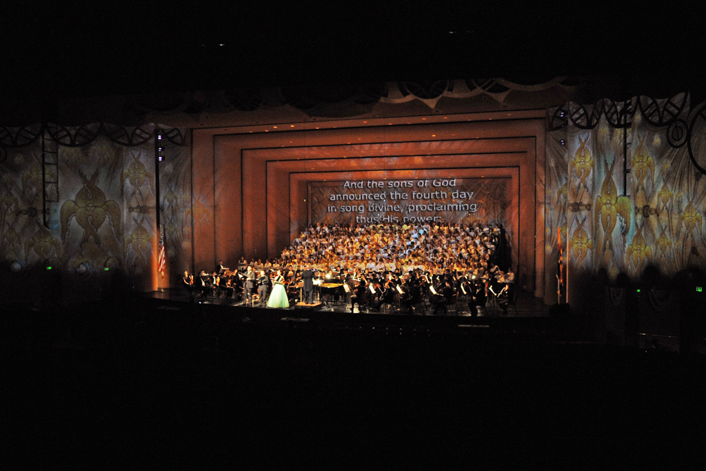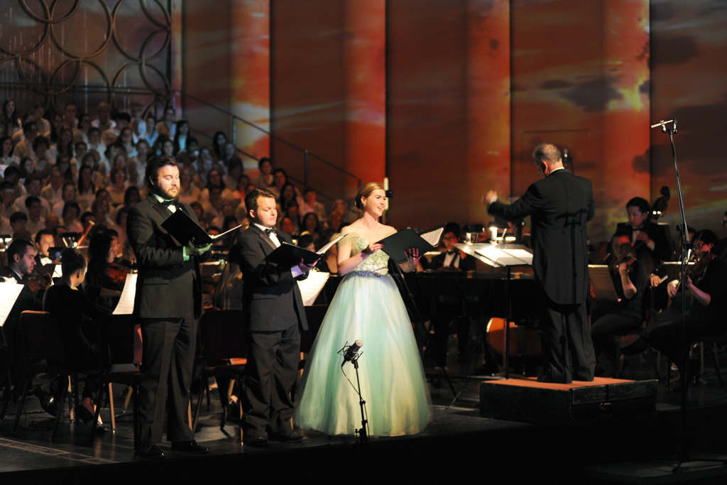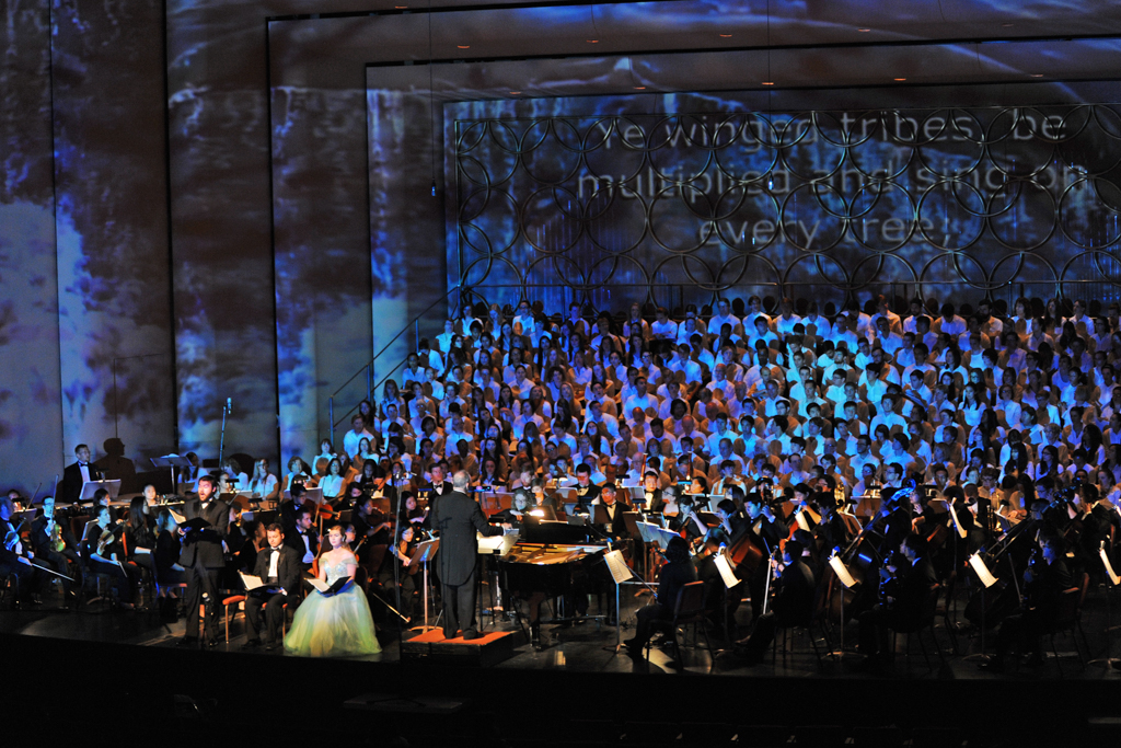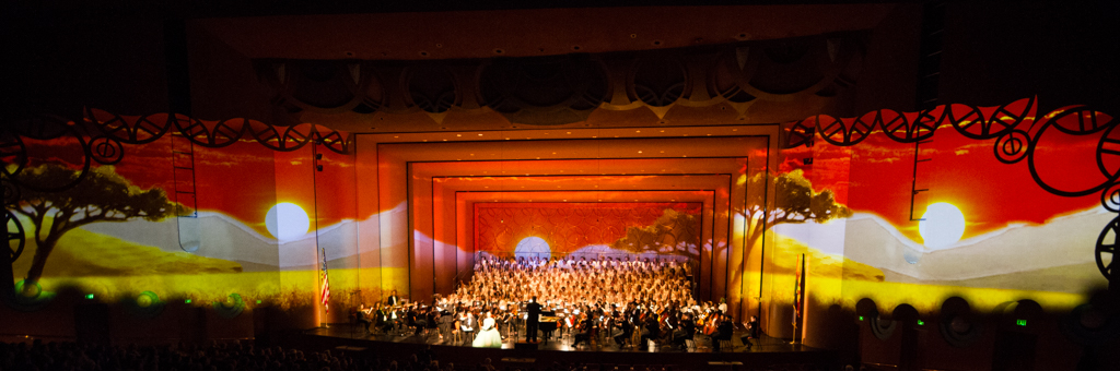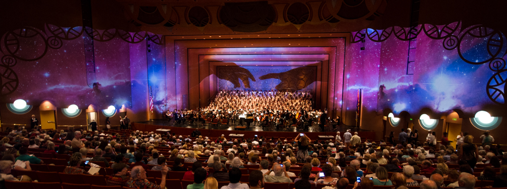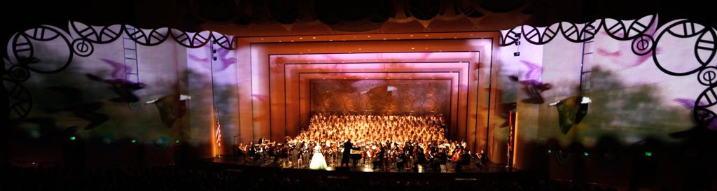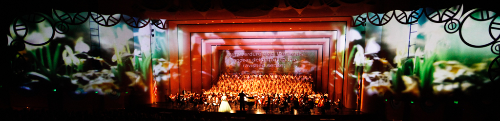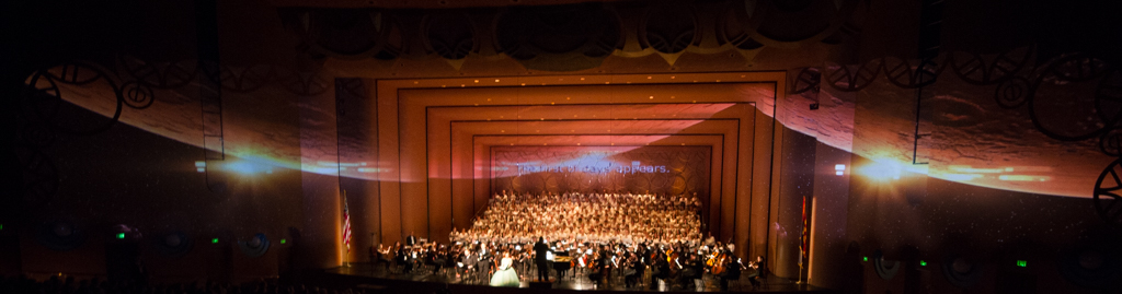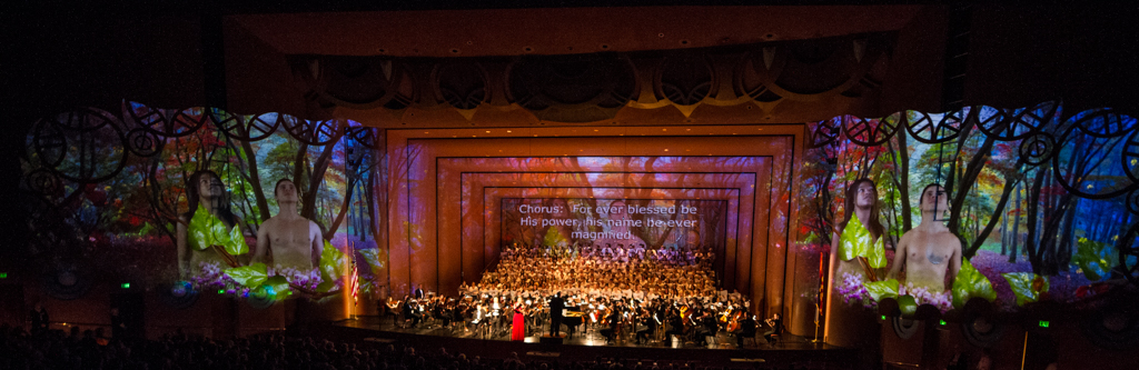 The Creation Project was a year-long series of events culminating in a multi-media performance of Haydn’s oratorio The Creation in April 2015 featuring a chorus of 300 singers, the ASU Symphony Orchestra, and student soloists under the direction of David Schildkret. The design team led by Boyd Branch and Jacob Pinholster developed original 2D and 3D animations and compositions that followed Haydn’s story of creation. The media content was mapped and projected onto the entire proscenium and the two adjacent walls creating 180 degrees of immersive video. A Microsoft Kinect was used to track motion from the conductor which drove procedural animations of swirling clouds and lightning storms based on the intensity of hand movement.