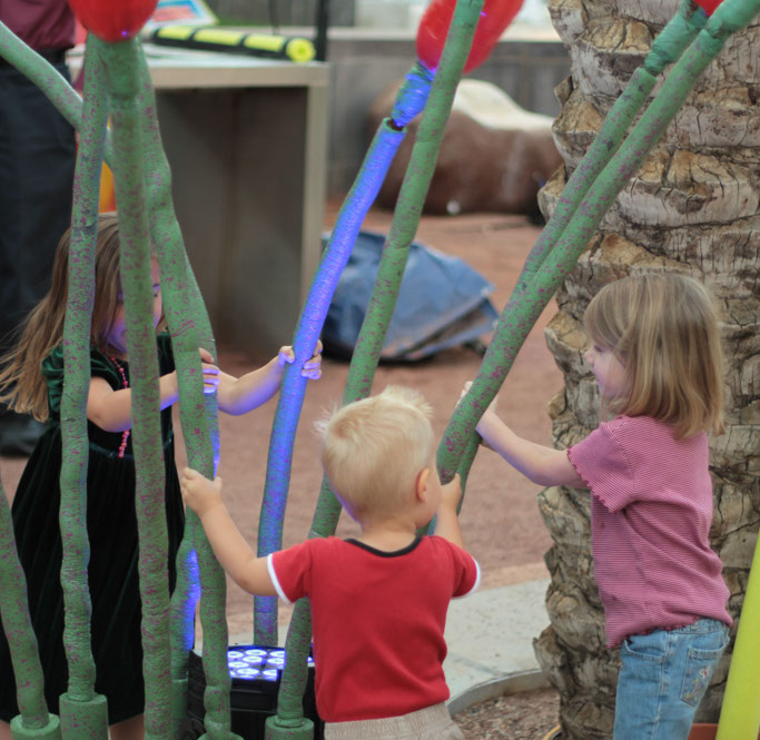 Summary: The Mesa Arts Center contracted Boyd Branch and Daniel Roth to lead a team of local artists to develop a novel interactive experience that explored the aesthetics of the desert. The team collaborated to develop an interactive cactus garden that featured large scale plush cacti that people could hug, talk to, make music with, and draw upon. We surrounded the cactus garden with architectural projection at night and augmented an adjacent water feature with sensors that allowed users to drive a desert themed sound scape and manipulate projections mapped to trees and buildings facing the fountain. Additionally we created a digital media projection lab outfitted with motion sensors and invited local media artists to feature their work.