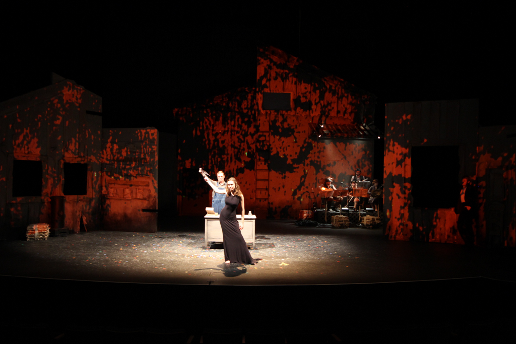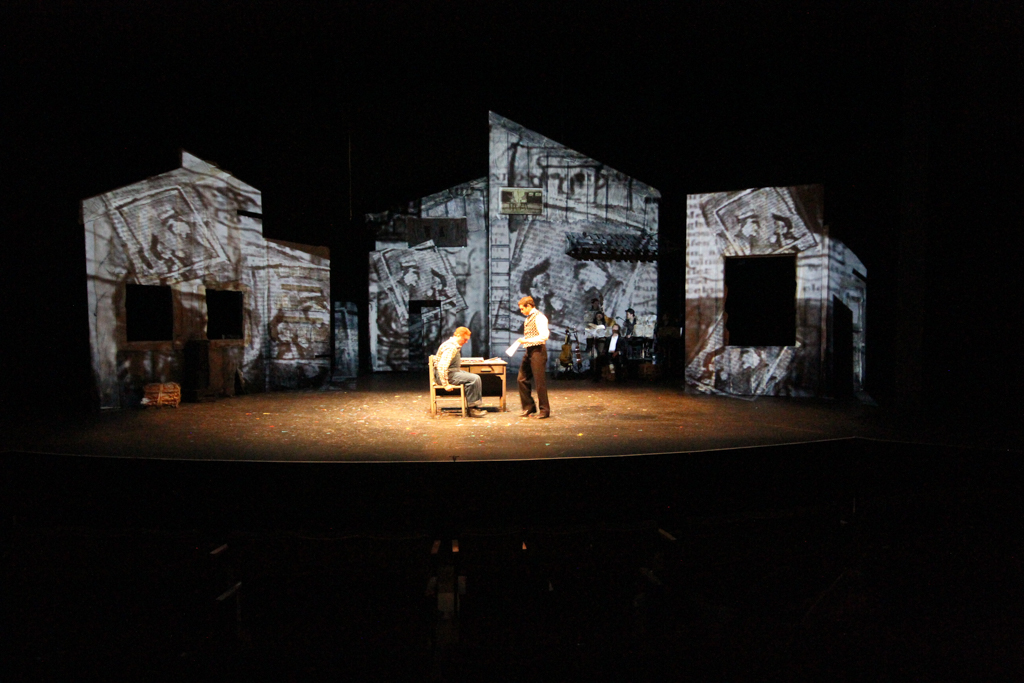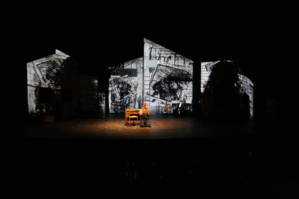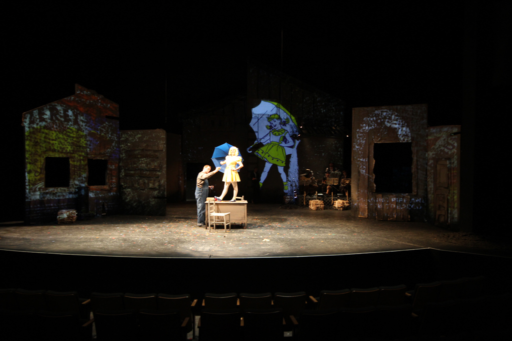 Two 8K Barco projectors hung parallel to canvas the set with media, and 2 4K Sanyo projectors for surtitles on opposite walls of the theatre. Each scenic element was video mapped for geometry correction and content was built for each unique surface.