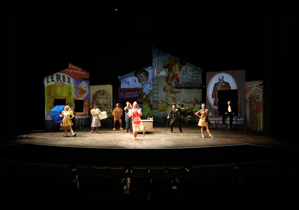 Artwork from James Castle was sampled, formatted, and reinterpreted for the unique surfaces of the set and prominent figures were digitally extracted and animated in Adobe Photoshop and After Effects.